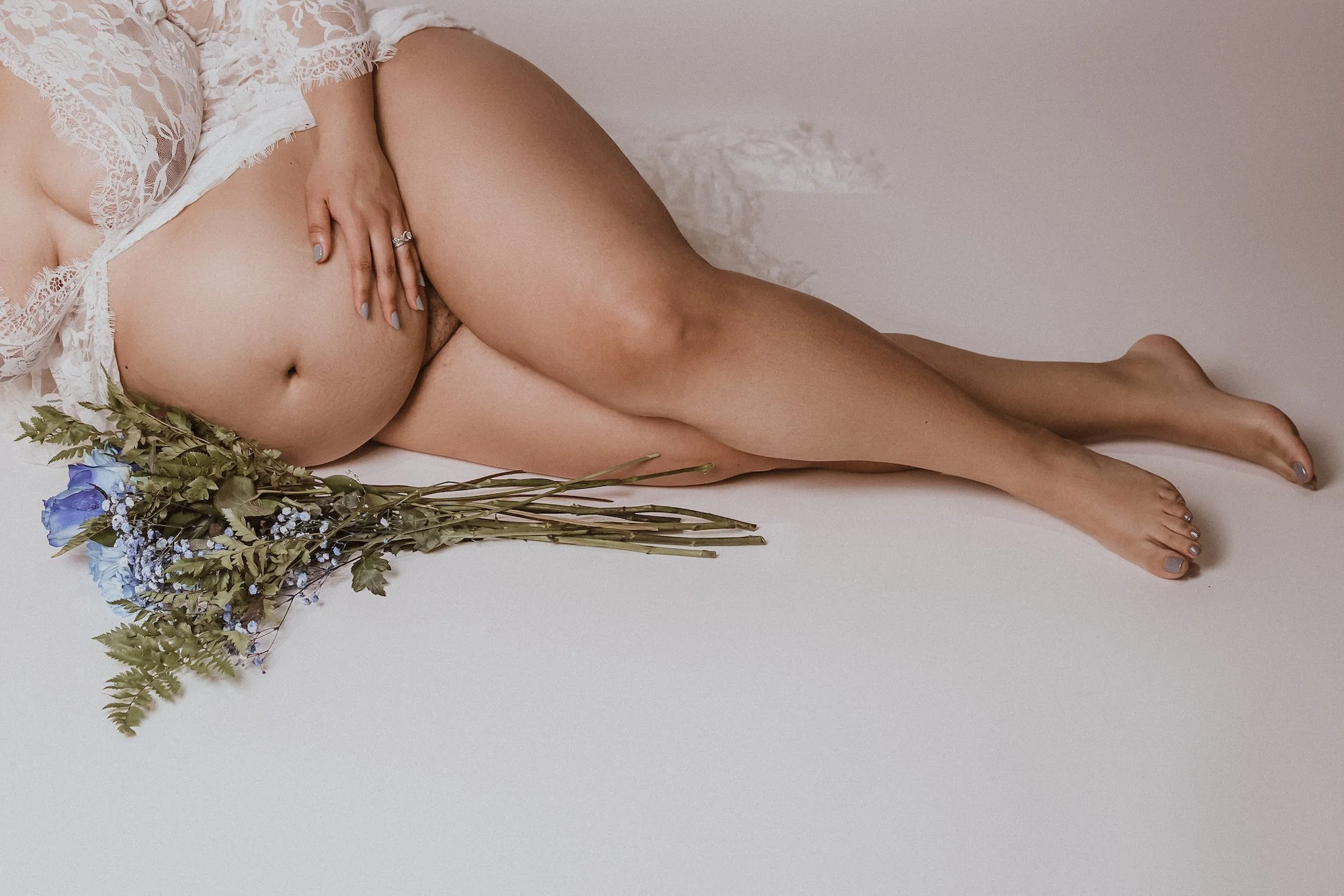 Many clients choose white bridal-themed lingerie or incorporate wedding accessories for an extra touch of elegance. Incorporate your wedding colors, or bring in bridal accessories such as your veil, garter, or even your wedding shoes to create a cohesive and memorable shoot that ties your photos to your special day.