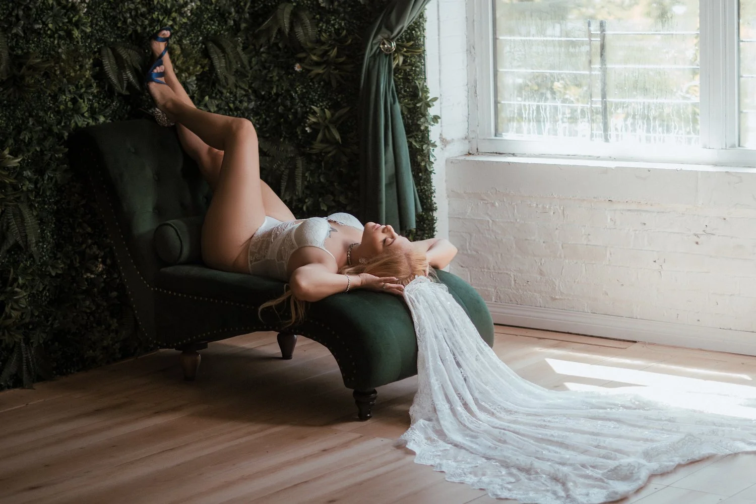 Bridal boudoir is a style of photography where brides pose for spicy or glamorous photos to present to their partner as a wedding gift. It's a personalized and romantic experience capturing the client’s beauty, confidence, and anticipation leading up to their wedding day. These images serve as an intimate gift for their partner and a timeless keepsake of their journey to matrimony.